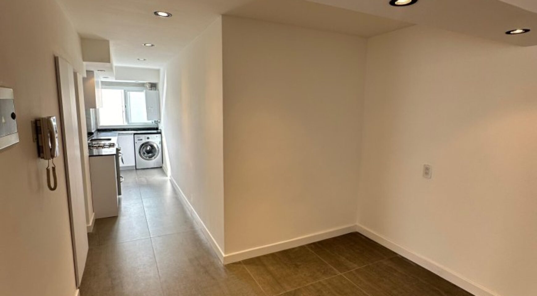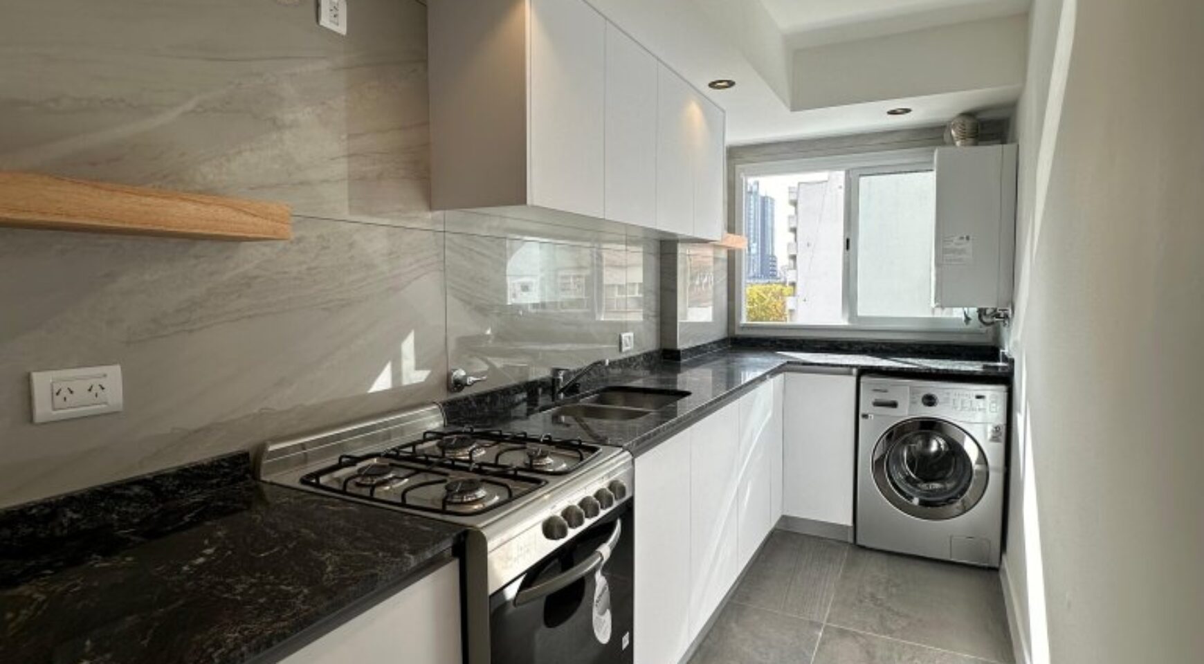 • Cocina separada de 5.5 x 1.6 m, totalmente revestida en porcelanato, con aberturas DVH, amoblamiento a medida y equipada con electrodomésticos a estrenar: lavarropas Samsung, cocina Domec y caldera.